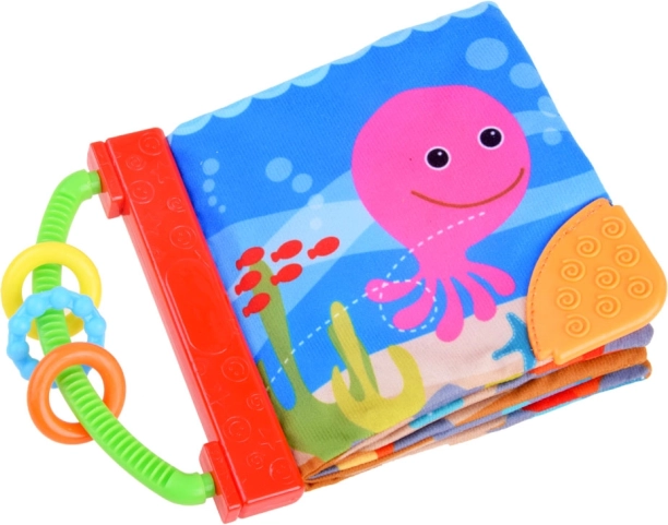 Ta miękka materiałowa książeczka została stworzona do bezpiecznego poznawania świata. Wyraziste ilustracje zwierzątek, słoneczka, motywów morskich czy cyfr pobudzają wzrok, a różne faktury i szeleszczące strony rozwijają zmysł dotyku. Zintegrowane elementy, takie jak piszczałka, lusterko i gryzaki, zapewniają dodatkowe wrażenia interaktywne.