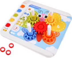 Kolorowe koła zębate i klocki rozwijają motorykę małą oraz zrozumienie mechaniki. Obrócenie jednego koła wprawia w ruch pozostałe – zabawa, która uczy przyczyny i skutku.