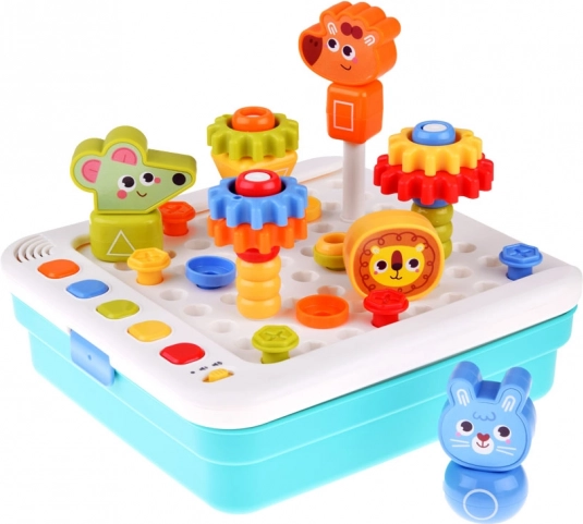 W zestawie znajdują się panel elektroniczny, szufladka na elementy, 5 kart tematycznych, kolorowe klocki i zębatki, figurki zwierząt (żyrafa, królik, myszka, lew) oraz kolorowa ilustrowana książeczka. Dziecko może budować ruchome konstrukcje, rozwijać koordynację ręka–oko i zrozumienie mechaniki przekładni. Czerwony przycisk na panelu uruchamia dodatkowe wyzwania dla jeszcze większej zabawy.
