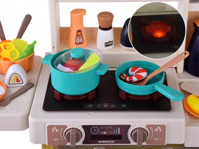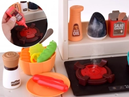 Po przekręceniu pokrętła palniki się podświetlają, słychać odgłosy gotowania, a z jednego palnika po uzupełnieniu wody unosi się bezpieczna para. Dzieci uwielbiają tak realistyczne wrażenia.