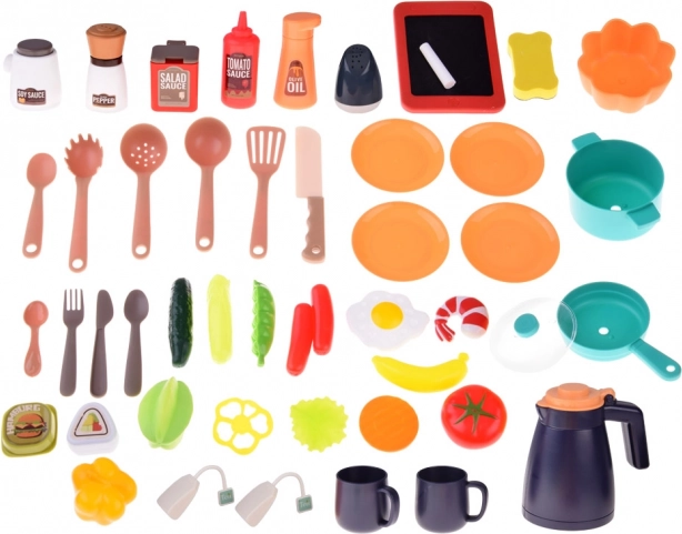 Dzięki 49‑częściowemu zestawowi akcesoriów dzieci łatwo przygotują „menu dnia” – od warzyw i jajek, przez sushi i hamburgera, po przyprawy. Nie zabrakło garnka z pokrywką, patelni, przyborów, talerzyków, filiżanek ani mini tabliczki do pisania kredą. Konstrukcja jest wytrzymała i bezpieczna, wykonana z wysokiej jakości plastiku z dbałością o detale.