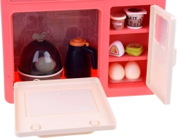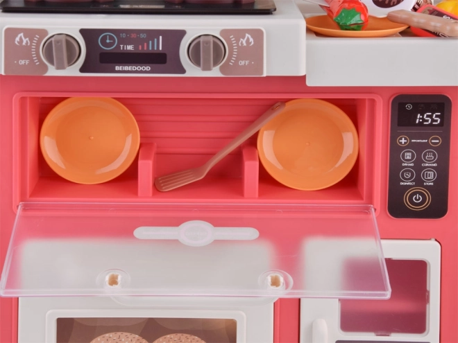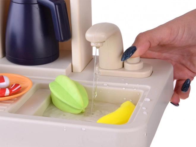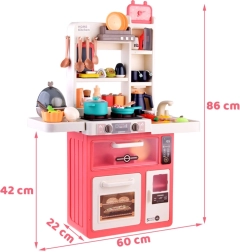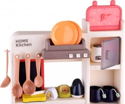 W zestawie znajduje się zlew z działającym kranem i zamkniętym obiegiem wody, dzięki czemu dzieci mogą „myć” naczynia. Kuchnia oferuje także piekarnik, zmywarkę, lodówkę, blat roboczy, zegar oraz pojemne schowki z półeczkami i haczykami.
