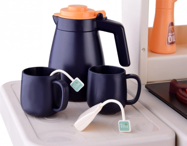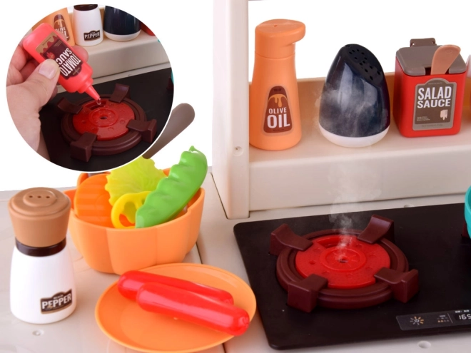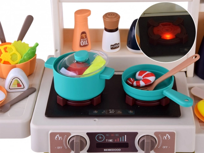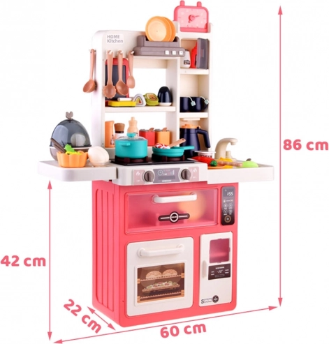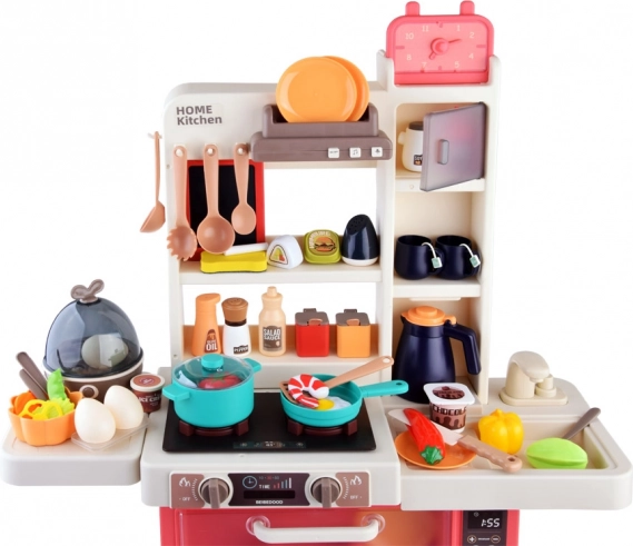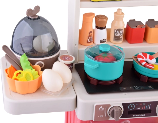 Rozbudowana dziecięca kuchnia z 63 elementami oferuje realistyczne efekty świetlne i dźwiękowe, bezpieczną parę podczas gotowania oraz działający kran z obiegiem wody. Nie brakuje piekarnika, zmywarki, lodówki, blatu roboczego ani panelu z podświetlanymi przyciskami i melodiami. Idealna do kreatywnej zabawy w gotowanie i rozwijania wyobraźni.