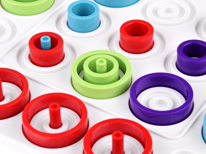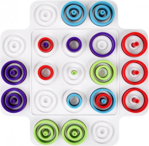 Kolorowe pierścienie i kołki wspierają koordynację oko–ręka, wyobraźnię przestrzenną oraz koncentrację – idealne dla dzieci i dorosłych.