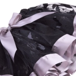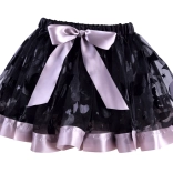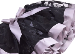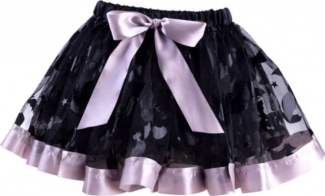 Czarna siateczkowa spódnica z dekoracyjnymi wzorami, fioletową lamówką i kokardą. Elastyczna talia zapewnia wygodę i łatwe zakładanie.