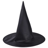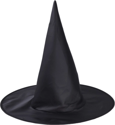 Tradycyjny czarny kapelusz czarownicy z wysokim czubkiem i szerokim rondem dopełnia autentyczny kostium.