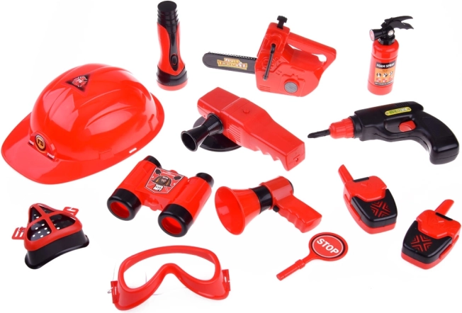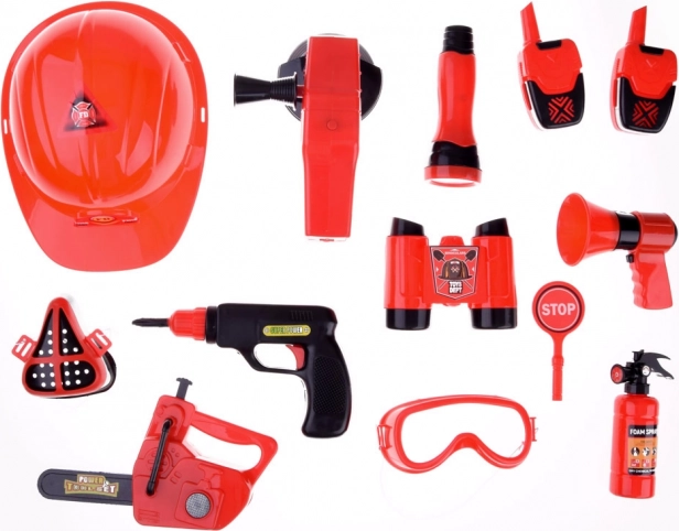 W skład zestawu wchodzi wszystko, co potrzebne do zabawy w strażaka: kask, lornetka, megafon, maska oraz inne akcesoria bezpieczeństwa.