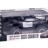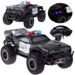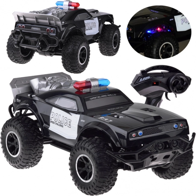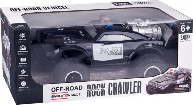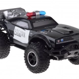Zestaw zawiera policyjny monster truck, zdalne sterowanie na częstotliwości 2,4 GHz, akumulator 500mAh 7,4V oraz ładowarkę USB.