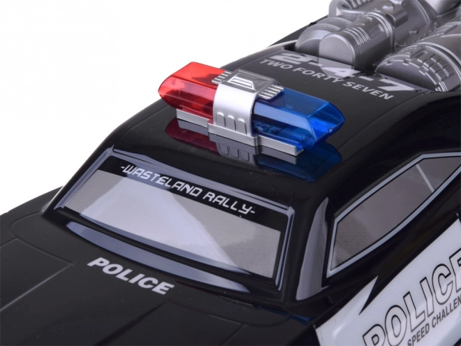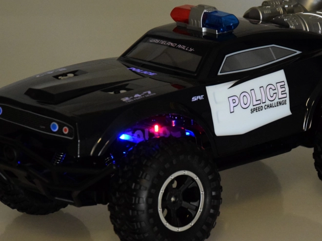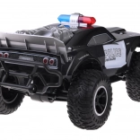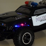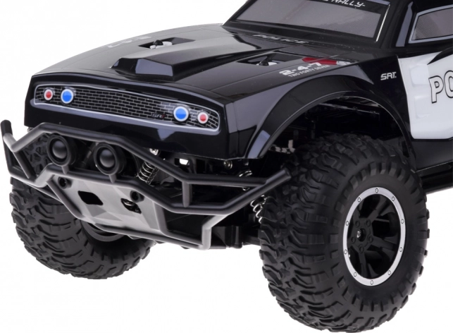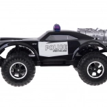 Monster truck wyróżnia się solidnym designem z wyraźnymi elementami policyjnymi, w tym czerwono-niebieskim oświetleniem i napisami POLICE.