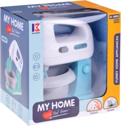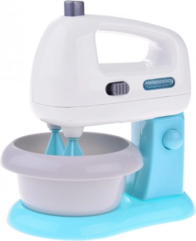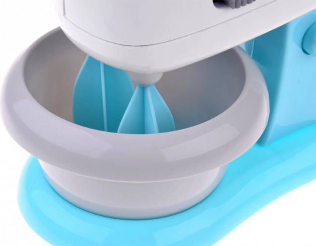Zabawka imituje prawdziwy mikser kuchenny z obrotowymi trzepaczkami i niebieskim świecącym efektem.