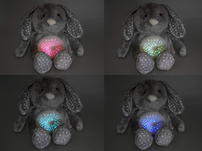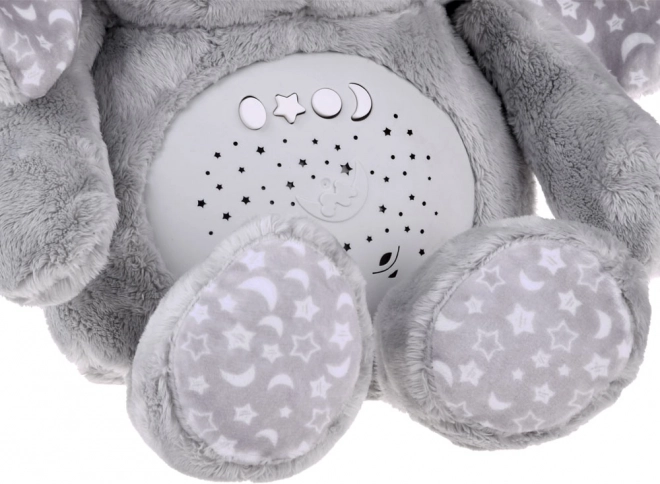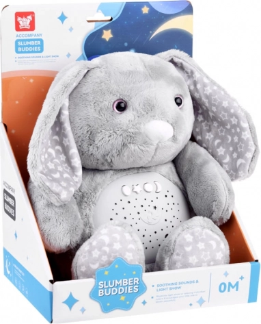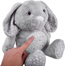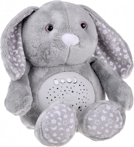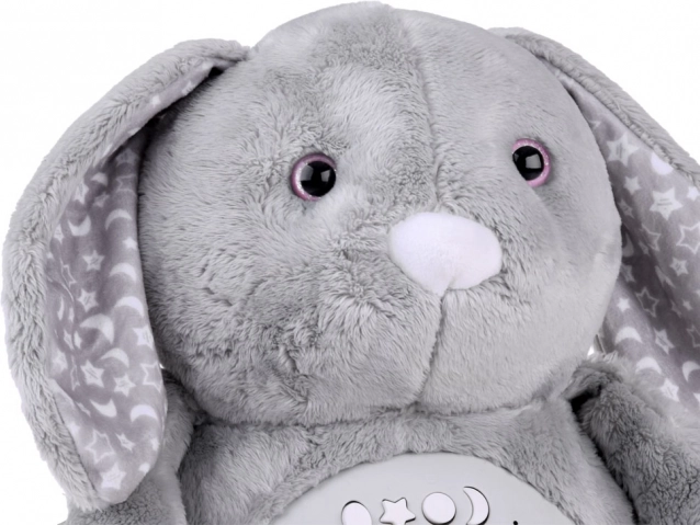 Ten miękki pluszowy króliczek jest wykonany z delikatnego materiału w stonowanej szarej barwie, ozdobiony wzorami gwiazd i księżyca na uszach i łapkach. Oczy są wykonane z plastiku, a nos wyhaftowany, co nadaje zabawce uroczy wygląd. Dzięki interaktywnemu panelowi umieszczonemu w brzuchu króliczka, staje się niezastąpionym towarzyszem dla dzieci, które mają trudności z zasypianiem.