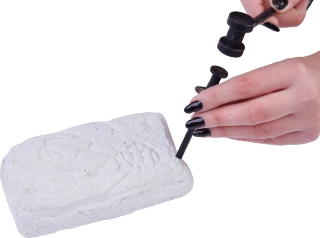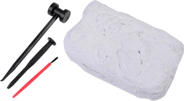 W zestawie znajduje się gipsowa „skała”, młoteczek, dłuto i pędzelek do starannego usuwania pyłu i odłamków. Wystarczy zabezpieczyć miejsce pracy, lekko zwilżyć powierzchnię i rozpocząć odkrywanie. Świetny pomysł na prezent dla małych geologów i paleontologów.