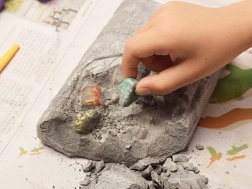 Solidny, a jednocześnie łatwy w obróbce blok gipsowy pozwala dzieciom bezpiecznie i stopniowo odkrywać ukryte kamienie prosto na stole.