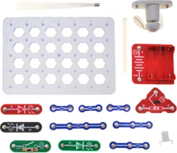 Podstawa z sześciokątną siatką, kolorowe elementy i przejrzyste podłączenia ułatwiają pierwsze próby z elektroniką nawet młodszym dzieciom.