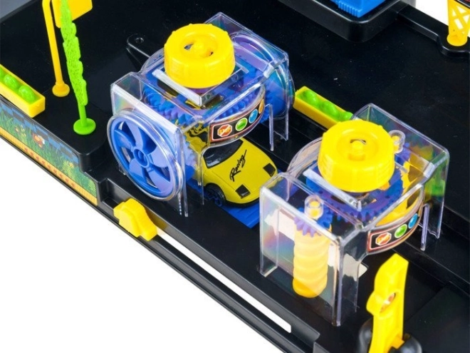 Dzieci mogą dokładnie „umyć” swoje pojazdy w kolorowej myjni ze szczotkami i stanowiskami przejazdowymi – zabawa i rozwój koordynacji w jednym.