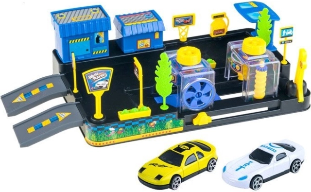 W komplecie znajdują się 2 sportowe autka (wysyłane losowo), gotowe od razu do jazdy przez myjnię i po rampach.