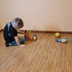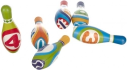 Każdy kręgiel ma wyraźny numer i wzór. Dzieci podczas gry ćwiczą liczenie, rozpoznawanie kolorów i małą motorykę.
