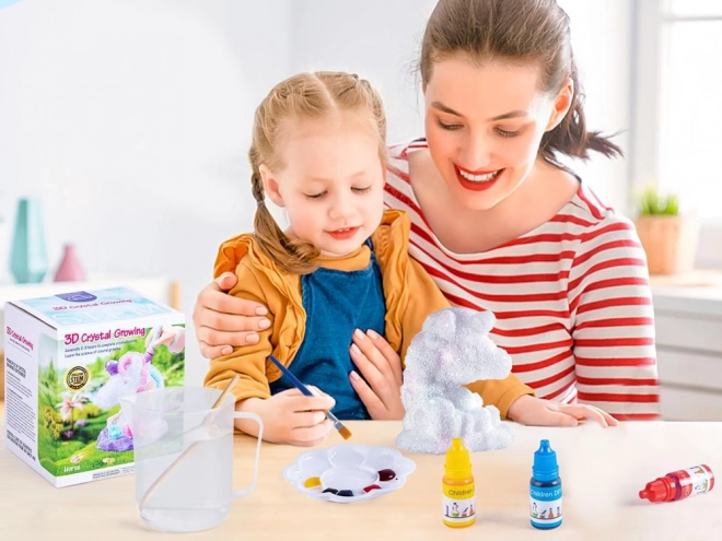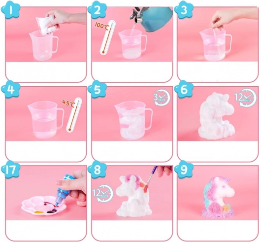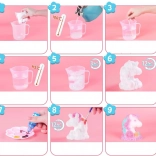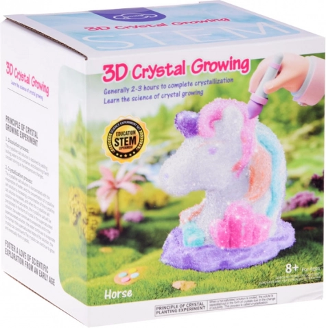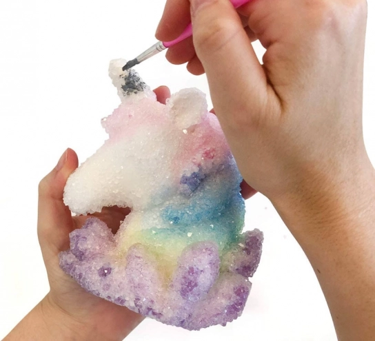 Zanurz figurkę w przygotowanym roztworze i obserwuj, jak zaczynają na niej rosnąć kryształy. Po wyschnięciu można pomalować jednorożca według własnej fantazji, co zapewnia nieograniczone możliwości i wzmacnia kreatywne myślenie dzieci.