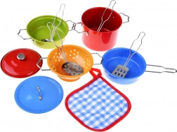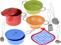 Kompletny zestaw zawiera dwie pokrywki, cedzak, durszlak oraz praktyczne przybory kuchenne do wielu scenariuszy zabawy.