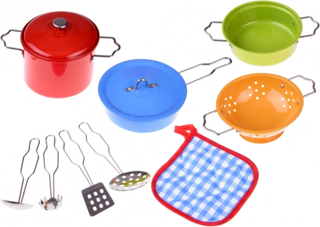 Kolorowy metalowy zestaw dla małych kucharzy oferuje realistyczną zabawę w gotowanie. Zawiera garnki, patelnię, cedzak i akcesoria, a także idealnie rozwija wyobraźnię, małą motorykę i zabawy w odgrywanie ról w dziecięcej kuchni.