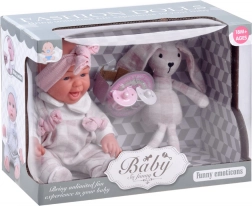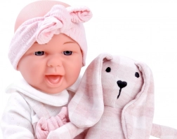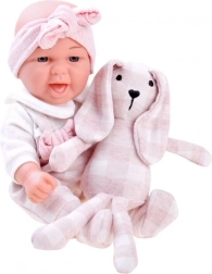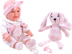Ta urocza lalka – niemowlę jest ubrana w biało‑różowy komplet z miękką opaską, koszulką połączoną z kraciastymi spodenkami i białymi skarpetkami. W zestawie znajdziesz także miękkiego pluszowego króliczka z wyszywanymi oczkami i noskiem oraz dwa smoczki (biały i różowy). Wszystko utrzymane jest w delikatnej różowo‑białej palecie, która wygląda subtelnie i czysto.