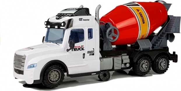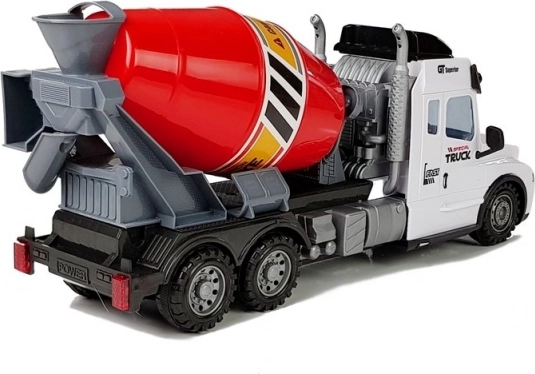 Biało‑czerwona betoniarka z realistycznymi detalami, ruchomym „bębnem” i płynnym toczniem kół tworzy prawdziwą budowlaną atmosferę podczas zabawy.