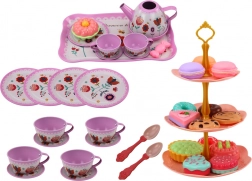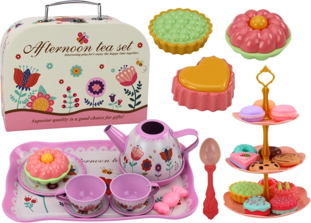 Zestaw zawiera wszystko, co potrzebne do niezapomnianych herbacianych przyjęć: małe i większe talerze, uroczy czajniczek do parzenia herbaty, filiżanki, podstawkę, stojak i różne kuszące desery. Każdy element jest starannie wykonany, a jego kolorystyka i wzornictwo są bardzo atrakcyjne dla dzieci, co wspiera kreatywną zabawę.