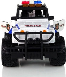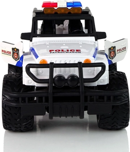 Zabawka z charakterystycznym czarno-białym wzornictwem, dużymi kołami i oznaczeniami policyjnymi, idealnie odwzorowująca prawdziwą akcję policyjną.