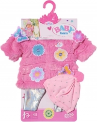 Ogrzej swoją lalkę urokliwym zestawem BABY born dla lalek 43 cm. Zestaw zawiera mięciutkie różowe futerko z brokatem, metalicznie błyszczące legginsy oraz czapeczkę z pomponem. Ozdobne naszywki kwiatów i motyli dodają strojowi uroku i stylu, a wysokiej jakości materiały zapewniają wygodne ubieranie i długą trwałość podczas codziennej zabawy.