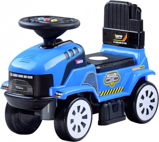 Kierownica z przyciskiem odtwarza wesołe melodie, a towarzyszące światełka rozwijają zmysły dziecka. Pod siedzeniem znajduje się praktyczny schowek na drobne skarby. Przyczepa ma otwory do przechowywania dołączonych narzędzi – łopatki i grabek – dzięki czemu dzieci mogą bawić się kreatywnie, przewożąc i nabierając.