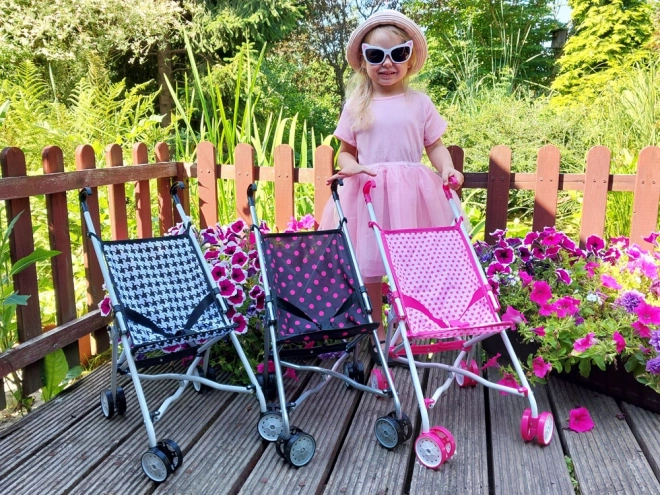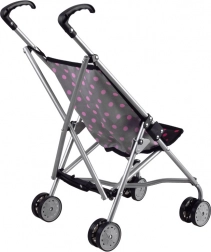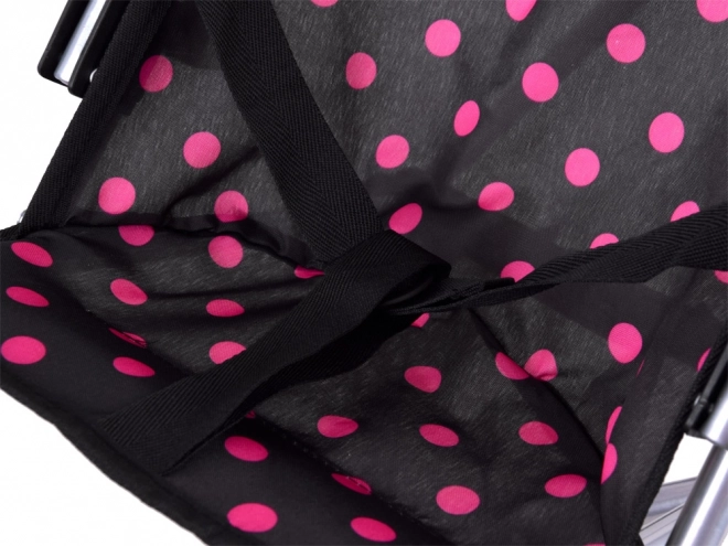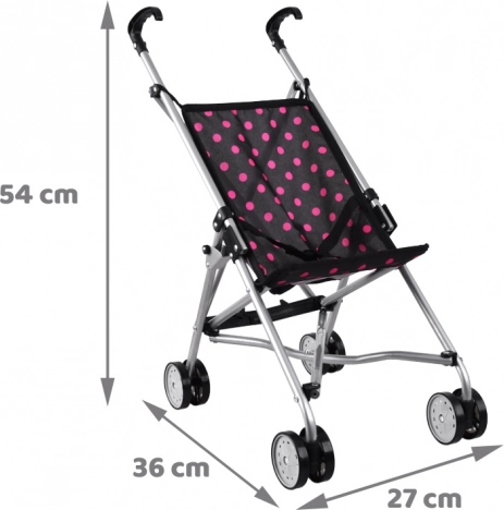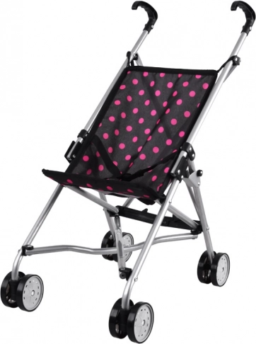 Lekki i kompaktowy wózek dla lalek w czarnym kolorze z różowymi kropkami ucieszy każde dziecko. Dzięki solidnej metalowej konstrukcji, wygodnym uchwytom i podwójnym kółkom dla płynnej jazdy świetnie się prowadzi i jest bezpieczny do codziennej zabawy.