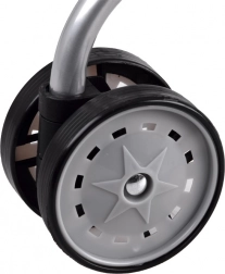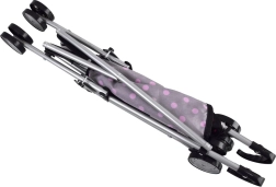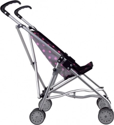 Materiałowe siedzisko w nowoczesnym wzorze czerni z różowymi kropkami jest trwałe i przyjemne w dotyku. Podwójne kółka gwarantują płynne prowadzenie i dobrą zwrotność na różnych powierzchniach. Bezpieczne elementy składania/rozkładania oraz paski w siedzisku pomagają utrzymać lalkę na miejscu.