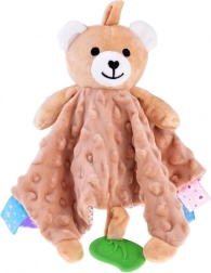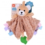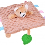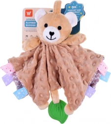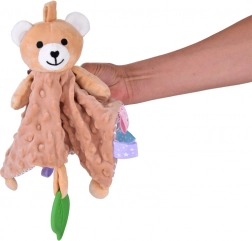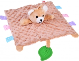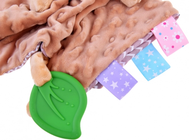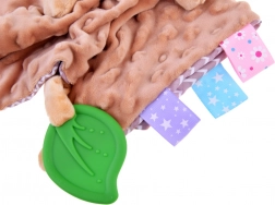Ta mięciutka przytulanka łączy komfort kocyka do tulenia i zabawkę sensoryczną. Dziecko zainteresują różnorodne faktury, szeleszczące i piszczące elementy oraz kolorowe metki na brzegach, które zachęcają do dotykania, ugniatania i ciągnięcia. Zielony silikonowy listek pełni funkcję gryzaka i pomaga masować wrażliwe dziąsła podczas ząbkowania.