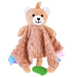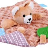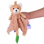 Kolorowe metki na brzegach oraz szeleszczące i piszczące elementy rozwijają ciekawość i koordynację.