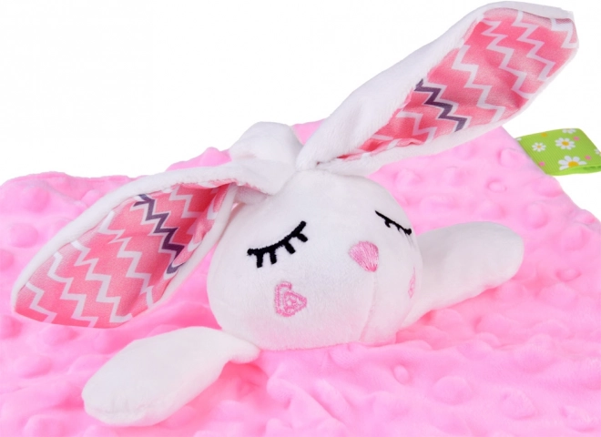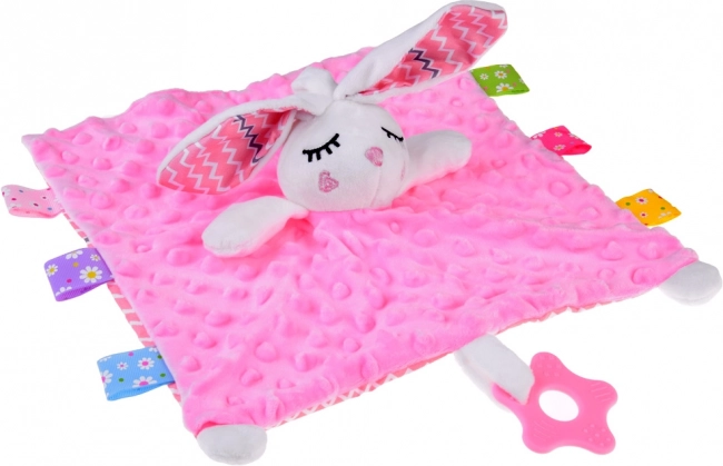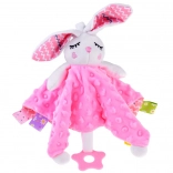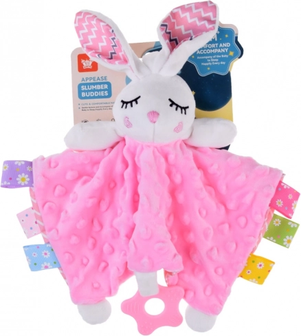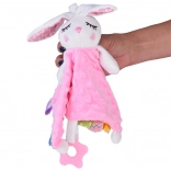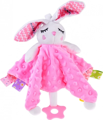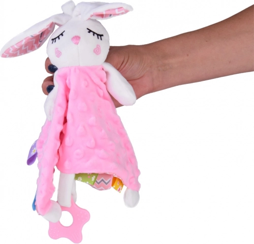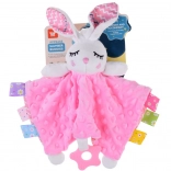 Urocza pluszowa przytulanka w kształcie króliczka z mięciutkim kocykiem, kolorowymi metkami i silikonowym gryzakiem zapewnia maluszkowi spokój i poczucie bezpieczeństwa. Wspiera rozwój sensoryczny, oferuje różnorodne faktury, szeleszczące i piszczące elementy i jest idealna do łóżeczka, wózka oraz fotelika samochodowego.