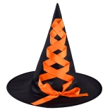 Klasyczny czarny kapelusz czarownicy z pomarańczową, satynową wstążką nadaje kostiumowi autentyczny wygląd i świetnie trzyma kształt.