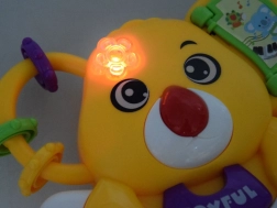 Dla rozwoju dotyku i małej motoryki na korpusie zabawki umieszczono koraliki do przesuwania, obrotowe kółeczko oraz kulkę z koralikami, która przyjemnie grzechocze. Przełączanie trybów odbywa się suwakiem w uszku misia, a zmianie towarzyszy krótka melodia.