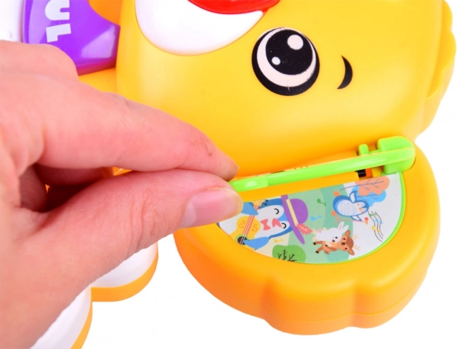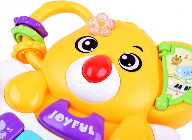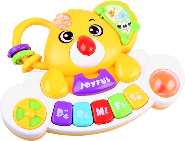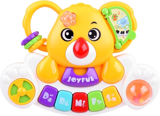 To kolorowe interaktywne pianinko łączy naukę i zabawę. Dzieci poznają podstawową gamę Do–So, posłuchają wesołych melodii oraz autentycznych odgłosów zwierząt (pies, kogut, koń, kot, słoń). Każde naciśnięcie klawiszy towarzyszy mrugające światełko, które zmienia kolory i wspiera percepcję wzrokową.