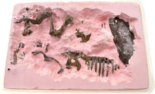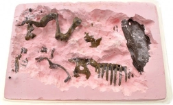 - Gipsowy blok do wykopalisk, pędzelek, dłutko, młoteczek ze skrobakiem, elementy szkieletu, podstawka