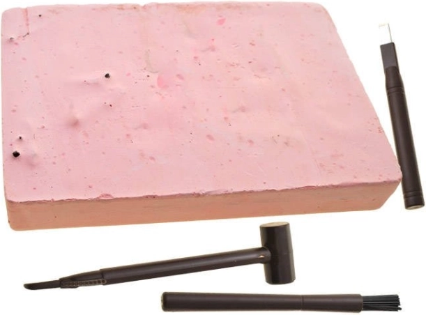 - Kompletny zestaw: blok, młoteczek ze skrobakiem, dłutko i pędzelek
