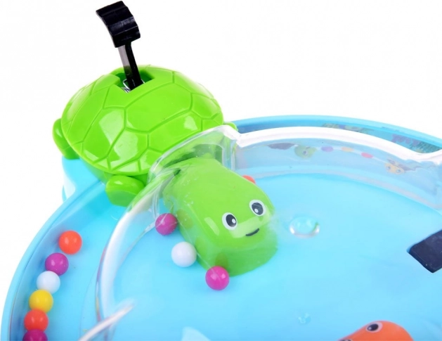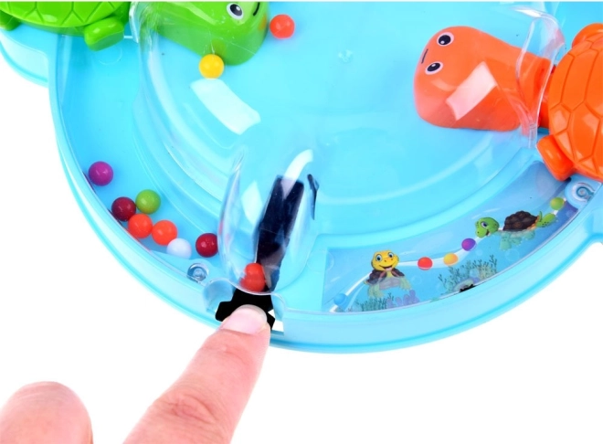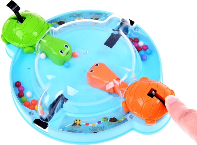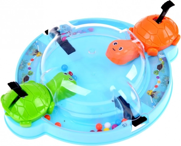 Gra trenuje zręczność, refleksy i uczy dzieci rozpoznawania kolorów. Jest idealna do grupowej zabawy z przyjaciółmi lub miłych chwil w rodzinie. Wszyscy siadają wygodnie wokół okrągłej podstawy, naciskają dźwignię, co sprawia, że żółwie otwierają usta i próbują złapać toczące się kulki.