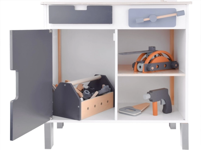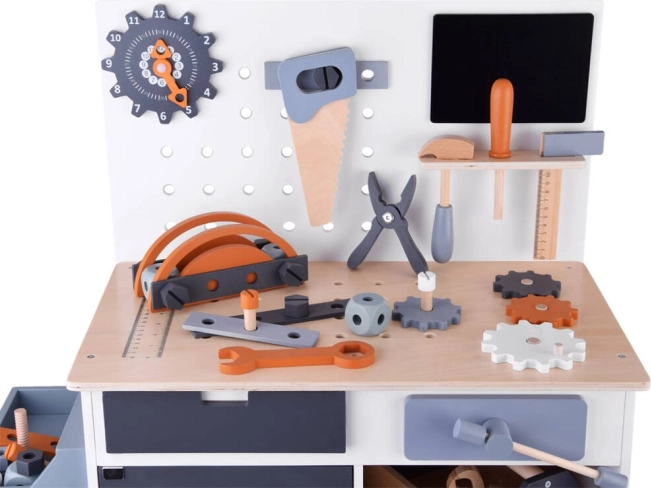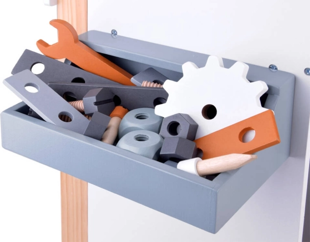 Stół wyposażony jest w miejsca do przechowywania i tablicę na narzędzia, które uczą dzieci efektywnego organizowania swoich narzędzi i akcesoriów.