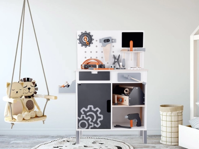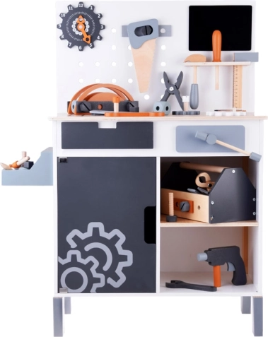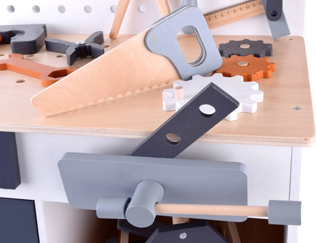 Drewniany stół roboczy dla dzieci to idealna zabawka do rozwijania kreatywności i drobnej motoryki. Dzięki szerokiej ofercie narzędzi, takich jak piła, młotek, śrubokręt i wiele innych, dzieci mogą zanurzać się w świecie gier DIY i symulować prawdziwe środowisko pracy.