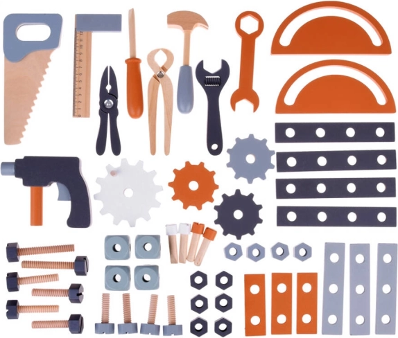 Zestaw zawiera szeroką gamę narzędzi, takich jak piła, wiertło, młotek, klucze, śrubokręty i inne - idealne do rozwijania praktycznych umiejętności.