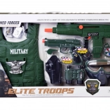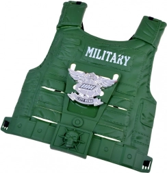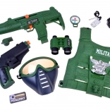 Dziecięcy wojskowy zestaw z kamizelką taktyczną i bogatymi akcesoriami do realistycznej zabawy w żołnierzy. Zawiera plastikową kamizelkę, dwie zabawkowe bronie z efektami dźwiękowymi, maskę, lornetkę, kompas, zegarek oraz inne dodatki do aktywnej i kreatywnej zabawy.