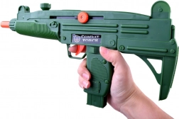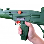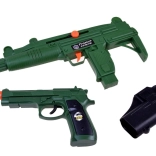 Krótki pistolet z efektami dźwiękowymi (baterie AG13 w zestawie) oraz naciągana strzelba dla pełnych akcji wrażeń przy bezpiecznej zabawie.