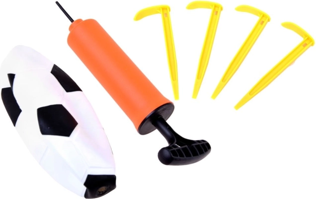 W zestawie znajduje się bramka z siatką, piłka, pompka oraz 4 śledzie do kotwienia – wszystko, czego dzieci potrzebują do natychmiastowej gry.