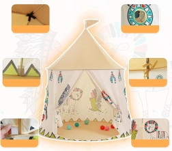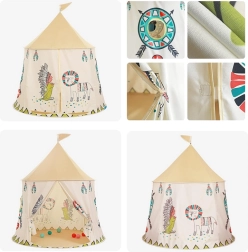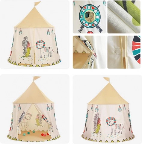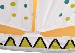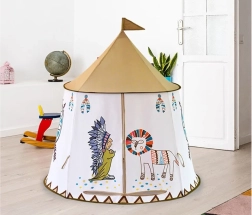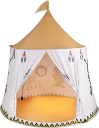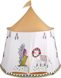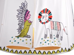 To okrągłe tipi z radosnymi indiańskimi nadrukami przemieni pokój w magiczny kącik do czytania, zabaw w odgrywanie ról i odpoczynku. Lekka konstrukcja zapewnia łatwy montaż/demontaż oraz przenoszenie w razie potrzeby, a oddychająca tkanina gwarantuje przyjemny klimat podczas zabawy.