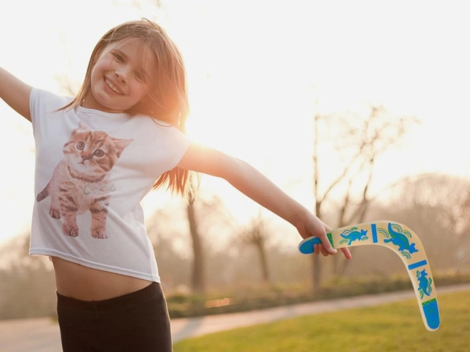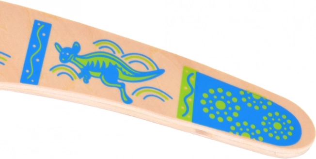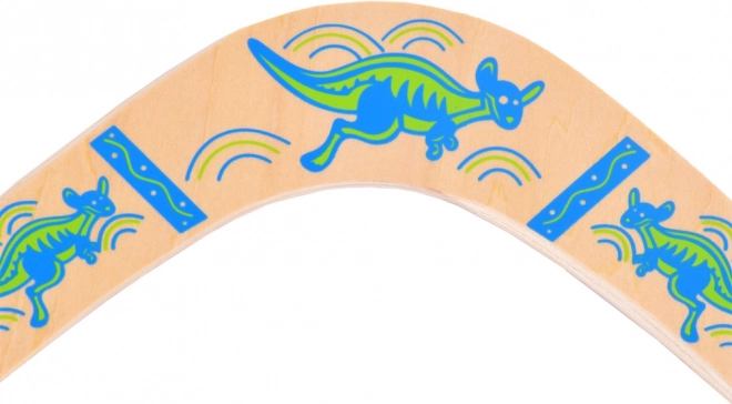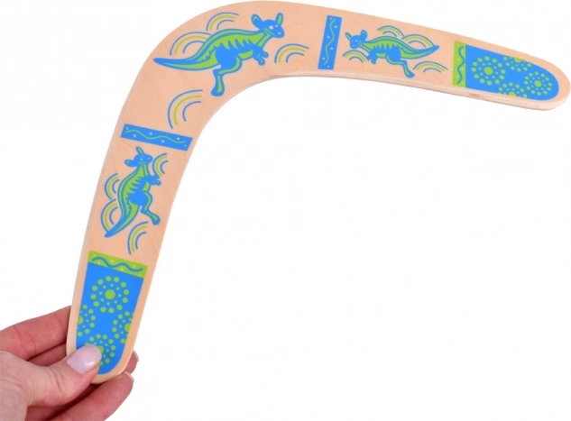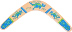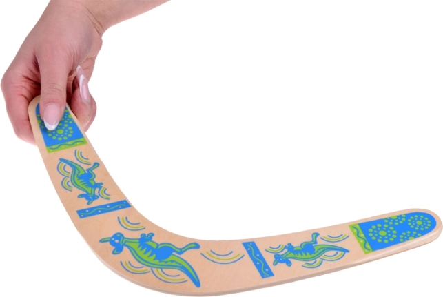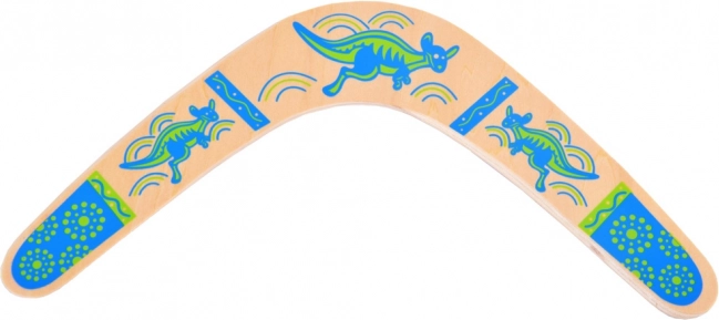 Drewniany bumerang inspirowany jest australijską tradycją i dostosowany do nowoczesnej rekreacyjnej zabawy. Jego wyważony profil i właściwa rotacja umożliwiają powrót do rzucającego przy prawidłowym rzucie. Kolorowe nadruki z motywami kangurów dodają stylu i zwiększają widoczność w powietrzu.