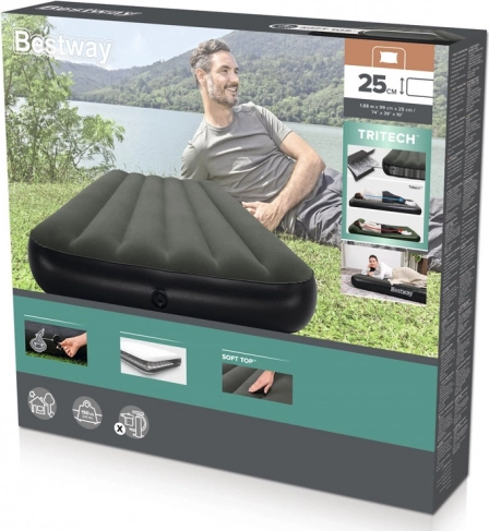 Materac dmuchany BESTWAY Tritech Twin zapewnia niezawodny komfort dla jednej osoby – gdy przyjmujesz gości, śpisz na kempingu lub potrzebujesz szybkiego, tymczasowego łóżka. Wielowarstwowe ścianki z materiału TRITECH zwiększają odporność na odkształcenia i zapewniają stabilność kształtu przez całą noc, a wewnętrzna konstrukcja I‑beam dodaje sztywności i stabilności. Przyjemna, miękka winylowa powierzchnia podnosi komfort snu.